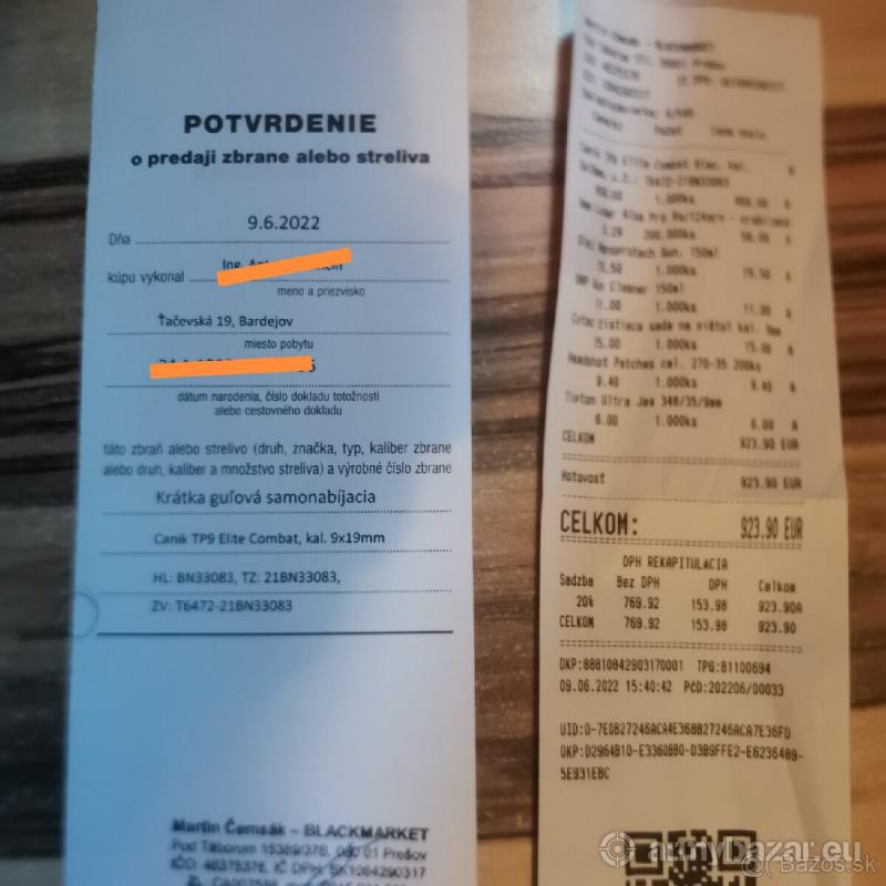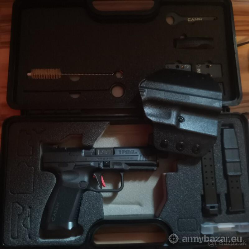 Popis: Predám pištoľ canik tp9 elite kombat so závitom na tlmič a s prípravou na kolimator...kupovaná v júny 2022 Vystrelených cca 200 nábojov... Prepis v Bardejove cena 750 eur volajte alebo píšte sms lebo maily mi nechodia spoľahlivo PARAMETRE ZBRANE: Kaliber: 9x19mm Kapacita: 15 - 18 nábojov Spúšťový mechanizmus: SA (Single-Action) / striker-fired Povrchová úprava: FDE / feritická nitrokarbonizácia (Tenifer) + Cerakote Mieridlá: kovové SAI, muška s červeným alebo zeleným svetlovodivým vláknom Dĺžka: 200mm Výška: 151,5mm Šírka: 38mm Dĺžka hlavne so závitom: 120mm Závit: M13,5x1 LH Hmotnosť (s prázdnym zásobníkom): 845g OBSAH BALENIA: prepravný kufrík výmenný grip